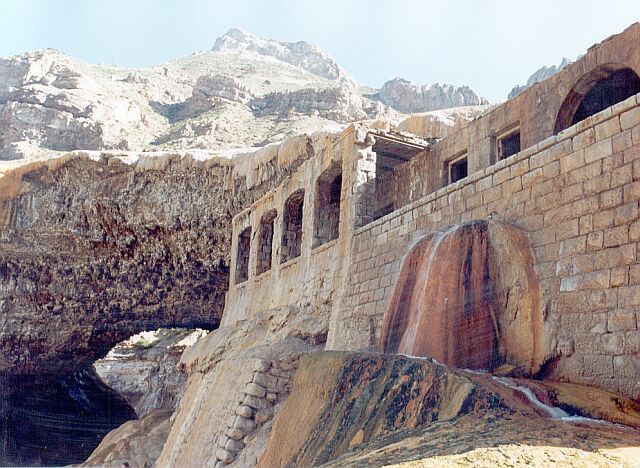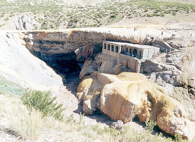 Vista del Puente natural y ruinas de las habitaciones para tomar baños termales |