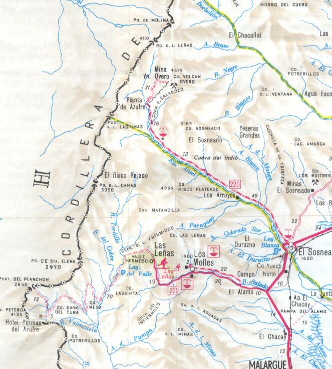 Carta del ACA con la zona de El Sosneado, Hotel Termal y Valle de Las Lágrimas donde cayó el Avión uruguayo en 1972.(click para agrandar) |