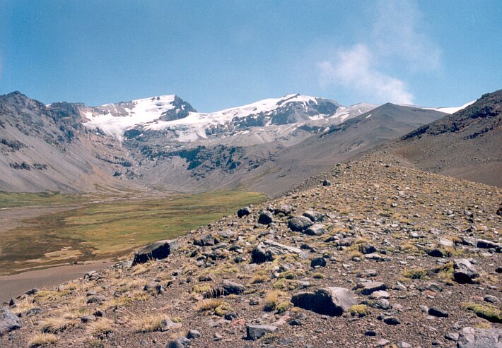 Después de andar más o menos 3 km se comienza a disfrutar de una vista majestuosa del Volcán Peteroa y cerros vecinos.