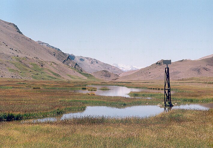 Llegamos al paso y recorrimos el lugar. Se notaban los restos de leña consumida en fogatas realizadas unos días antes con motivo de un encuentro binacional y el hito internacional se encontraba rodeado por el agua de una vega.
