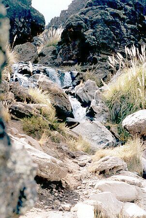El curso de agua de la foto de la izquierda nace por deshielo como arroyo de agua fría pero en esta época del año solamente recibe agua caliente que brota de la montaña. Su temperatura cercana a los 30 grados centígrados permite que los turistas tomen baños prolongados.