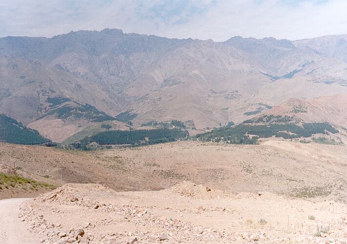 Plantaciones de pino en inmediaciones de Huinganco. Al fondo cerro "La Corona" en la Cordillera del Viento |