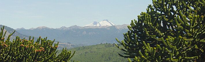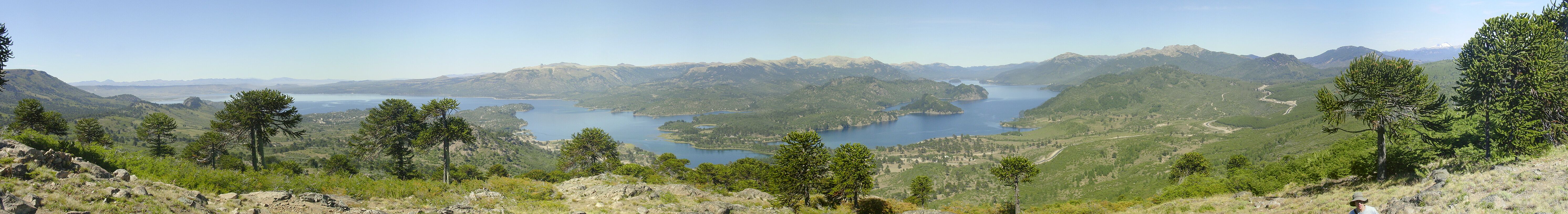 Detrás los lagos argentinos Aluminé y Moquehue y las lagunas chilenas de Icalma y Gualletue. Al fondo se destaca un cinturón de volcanes argentinos y chilenos entre los que se distinguen claramente el Lanín, Villarrica, Llaima, Sierra Nevada, Llonquimay, Tolhuaca, Callaqui y Copahue.