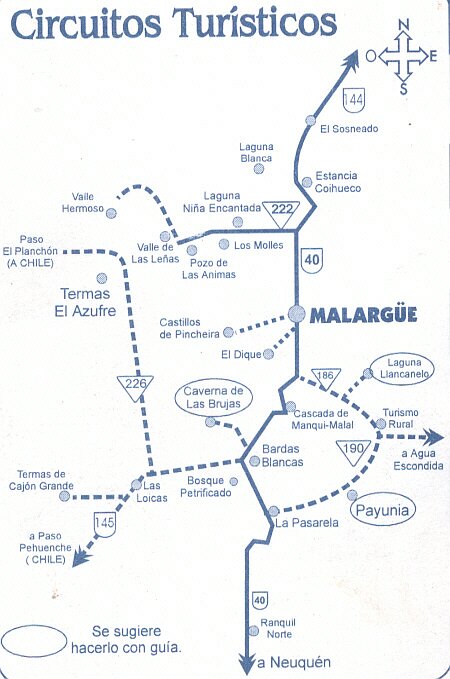 En un rato llegamos a Malargüe y fuimos a consultar sobre la factibilidad de llegar hasta las Termas del Azufre, en inmediaciones del Paso Vergara o Planchón y sobre excursiones a la zona de volcanes apagados conocida como Payunia.