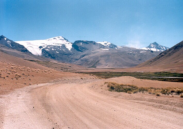 Llegando a Termas del Azufre que se encuentran a los pies del glaciar que baja del cerro El Peñón (izq) y a la derecha se observa el humo que emana del Volcán Peteroa |