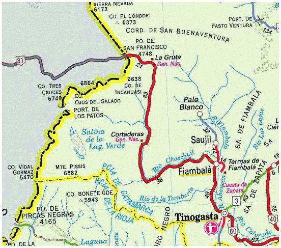 El recorrido Tinogasta - San Francisco - Laguna Verde (CH) figura en el Relato NOA 2006 y como el paisaje nos gustó mucho, volvimos a incluirlo en este periplo. Sugiero mirar ambos relatos ya que varias de las fotografías tomadas en el año 2006 no se incluyen en este viaje para no ser reiterativos pero SÍ se agregan tomas de las Vegas del San Francisco, que no visitamos con anterioridad. |