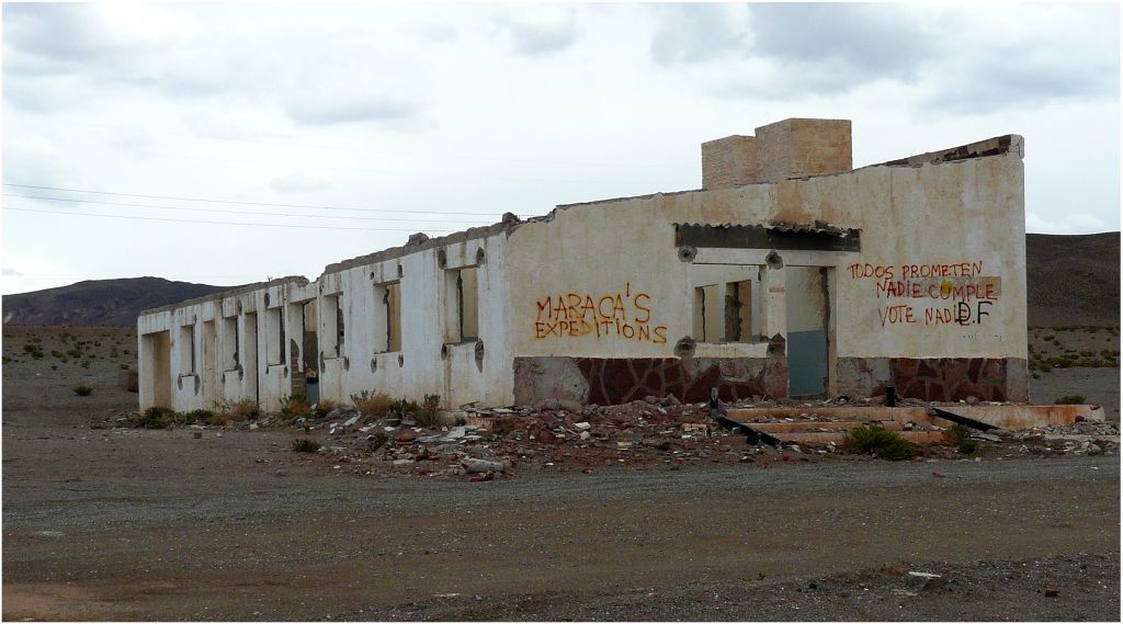 Es lindo llegar a esos parajes y encontrar los edificios abandonados , tal cual fueron dejados, pero siempre hay algún inadaptado que usa las paredes para sus estúpidas inscripciones.