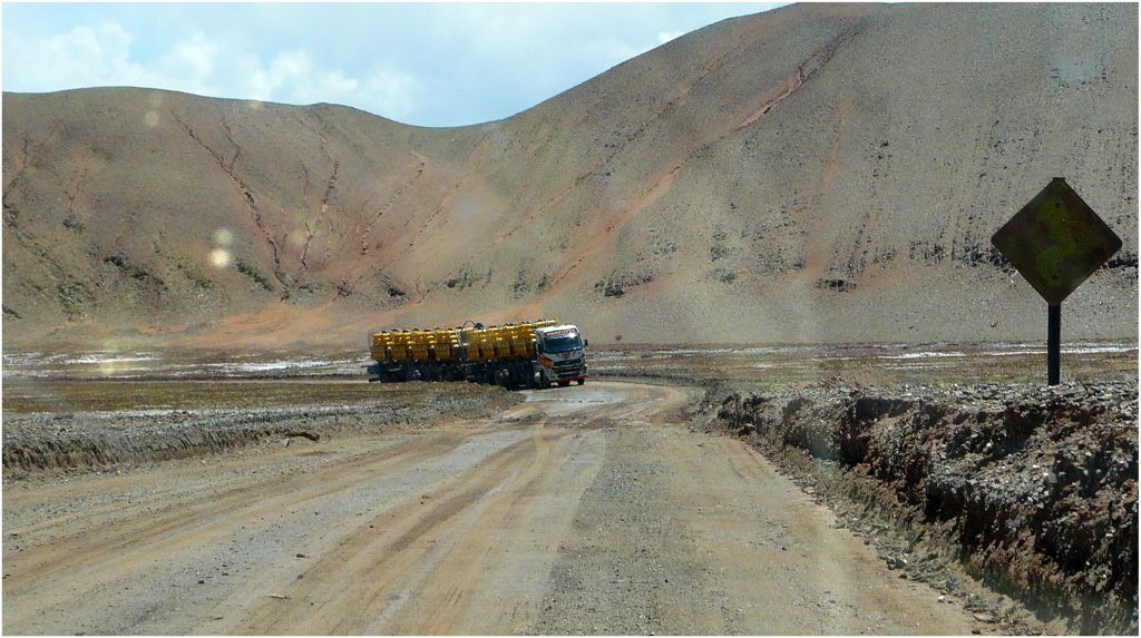 Empezamos a cruzar camiones con acoplado, incluso con dos acoplados, que vienen del norte cargados con tubos de gas. Luego veríamos que ese gas se envasa en la planta del poblado “Salar de Pocitos” y que es transportado para ser usado en las minas.