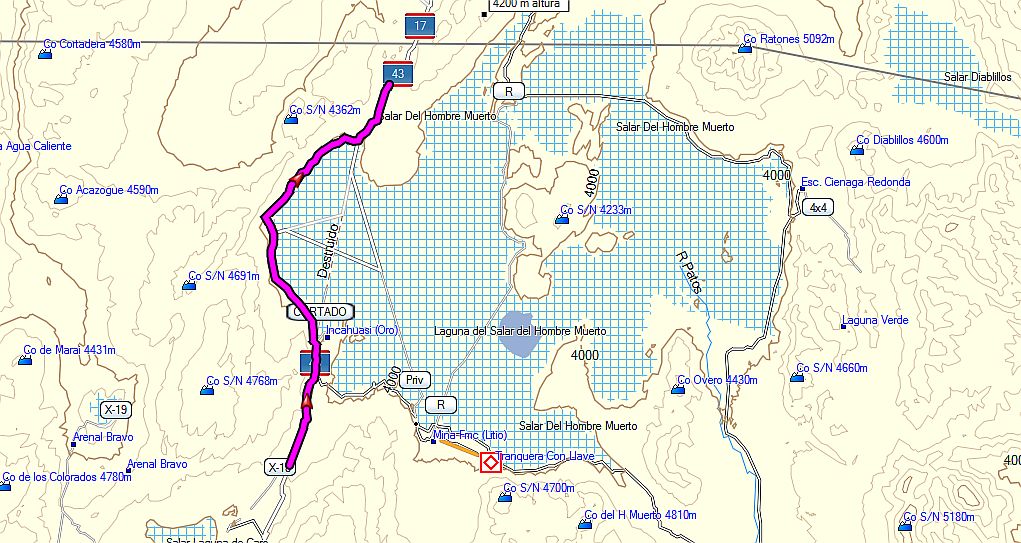 Luego comienza el descenso ya que hay que bajar hasta el nivel del Salar del Hombre Muerto. Antes de llegar, las tres camionetas que venían de recoger técnicos en ADLS nos pasaron raudamente, cortando camino por una traza de mayor pendiente mientras nosotros seguíamos la ruta que baja por un tramo de cornisa.