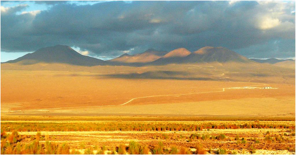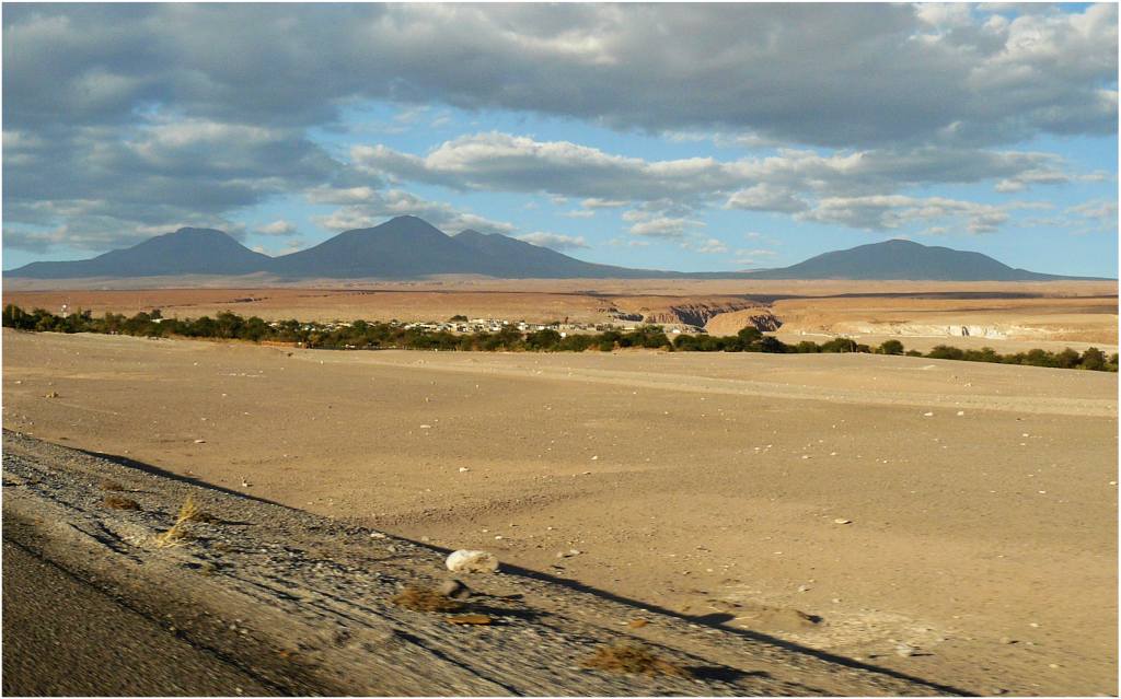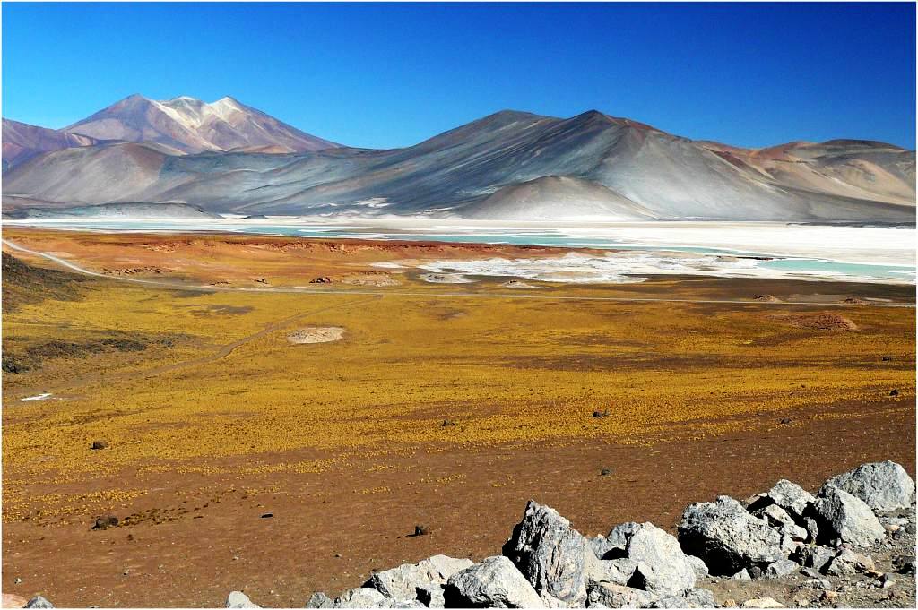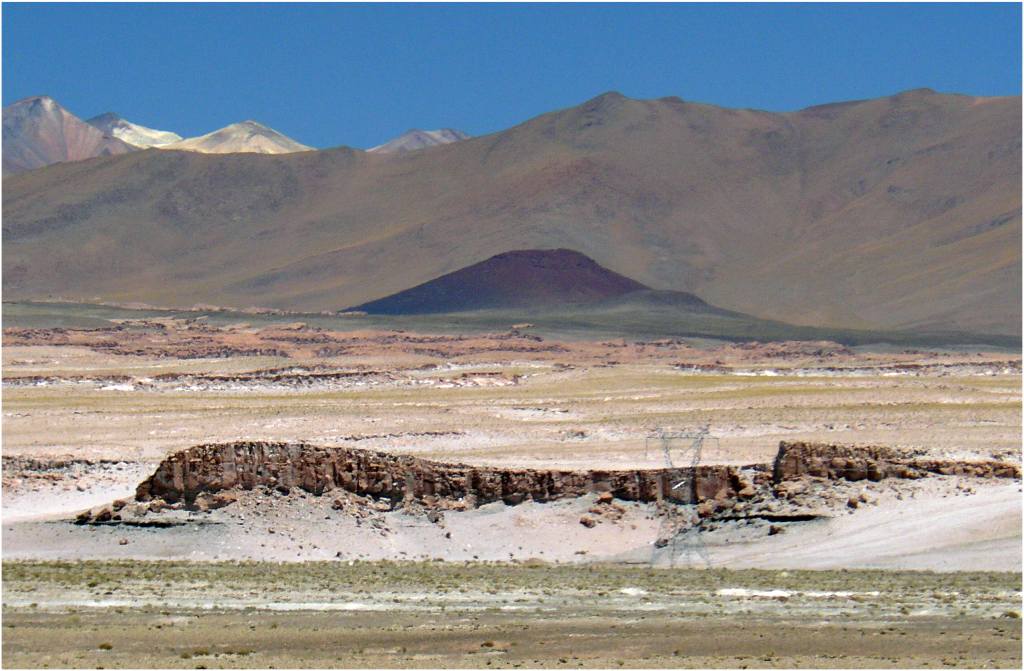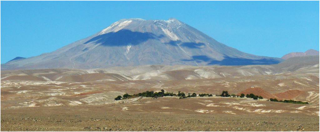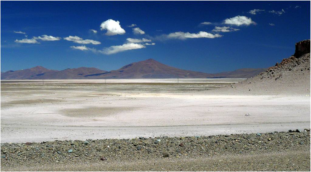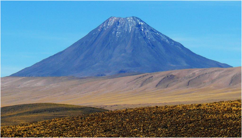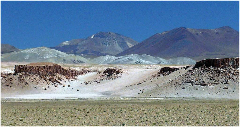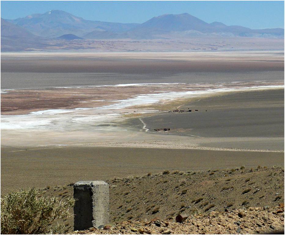 Siguen apareciendo los picos que se destacan de la planicie: Cerro Corona, Volcanes Láscar (activo), Aguas Calientes, Acamarachi, Pili, Laguna Verde, Colochi, Hécar, Potor y Rayado.
