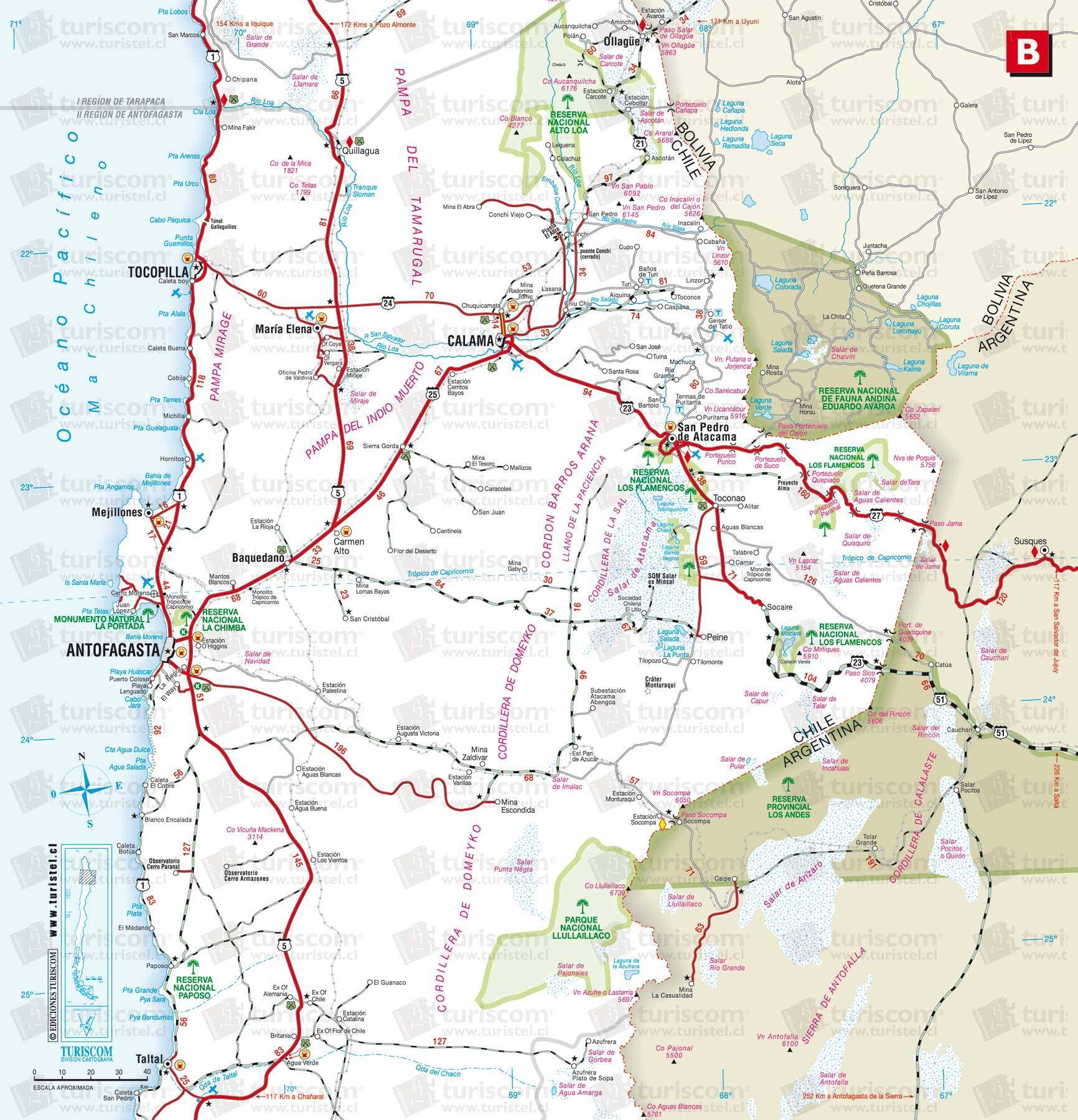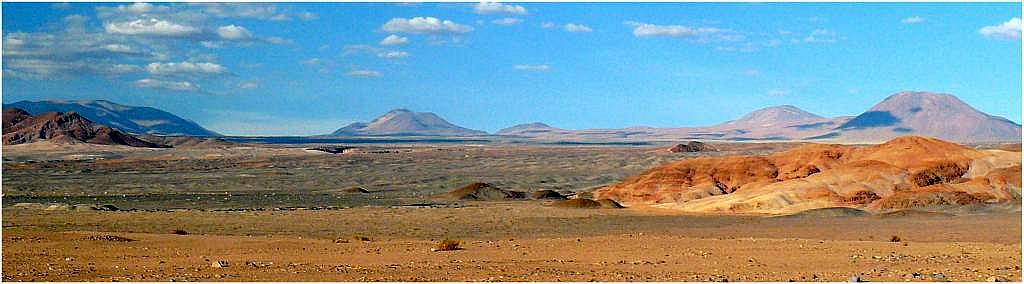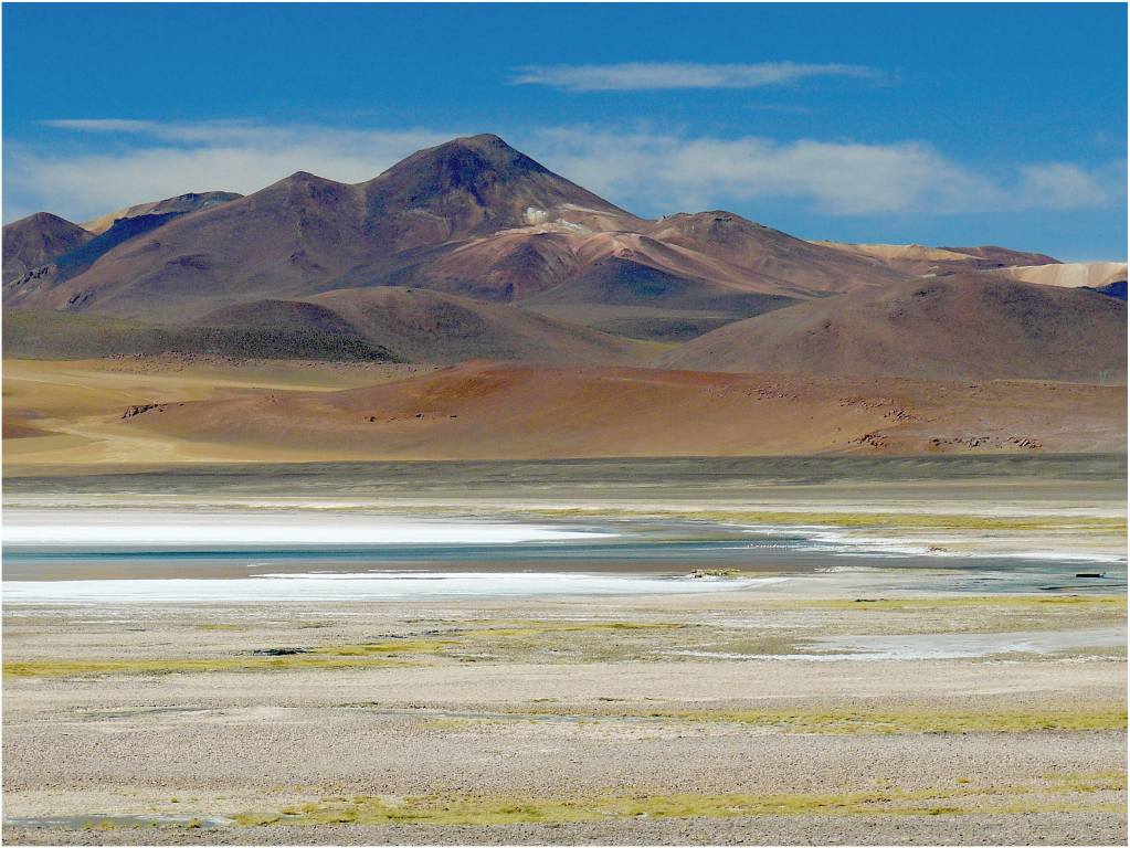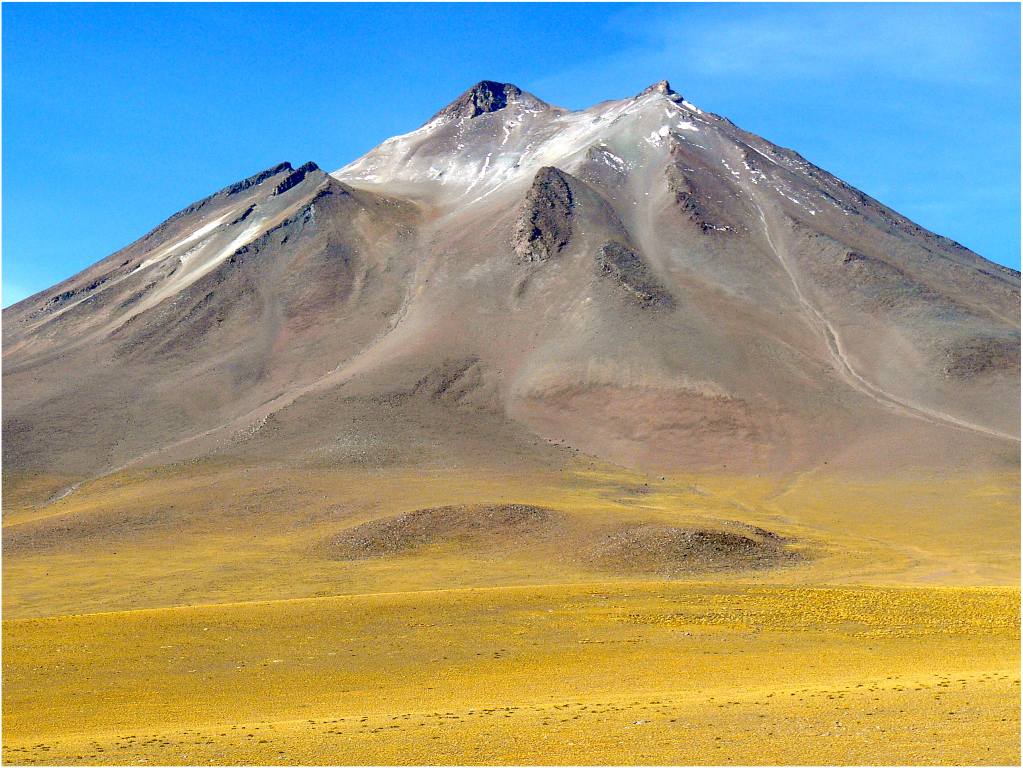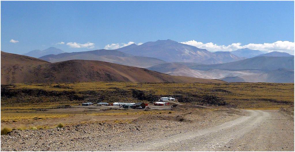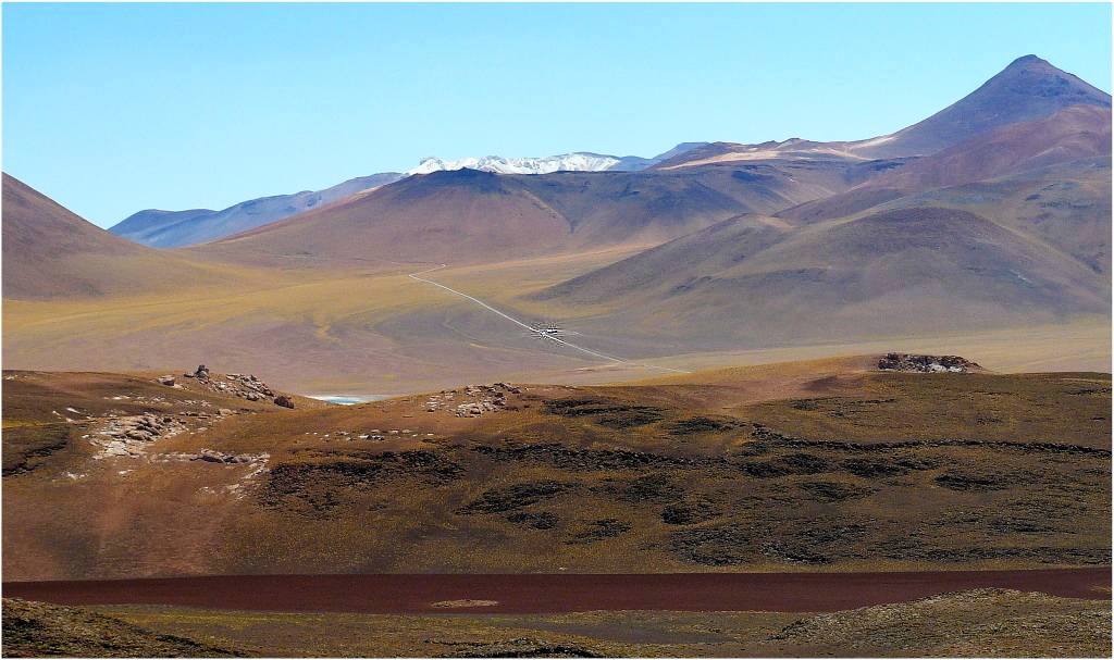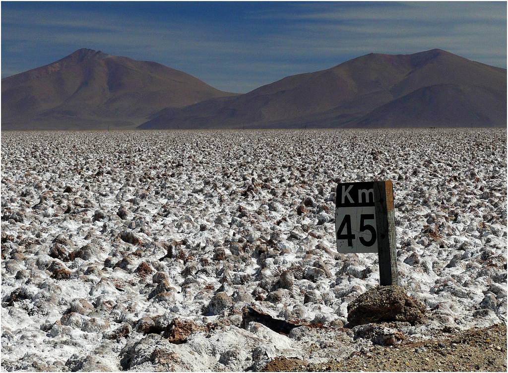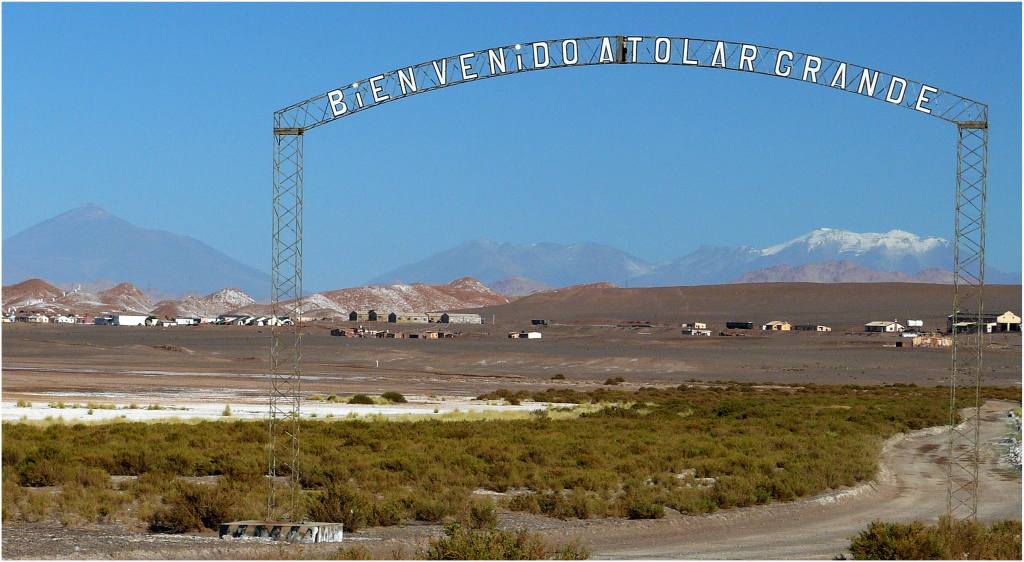 Siguen apareciendo los picos que se destacan de la planicie: Cerro Corona, Volcanes Láscar (activo), Aguas Calientes, Acamarachi, Pili, Laguna Verde, Colochi, Hécar, Potor y Rayado.