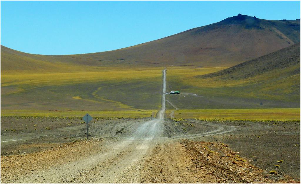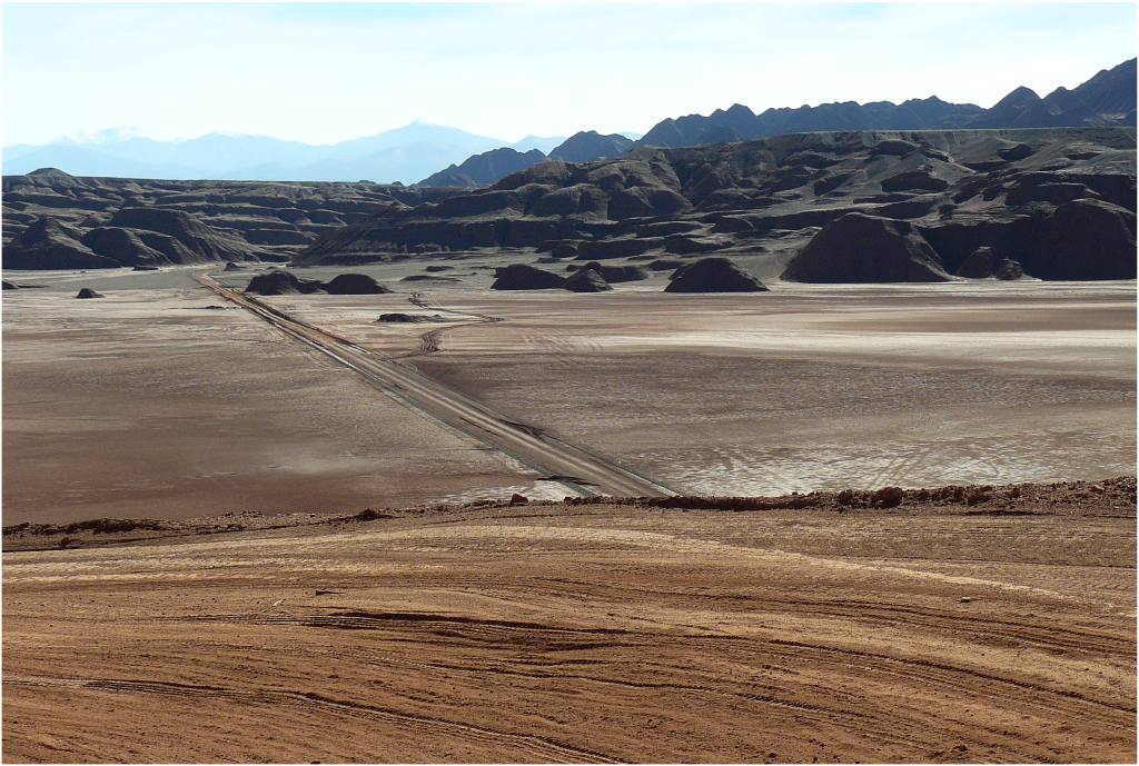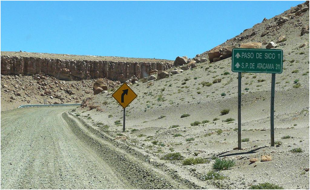 A lo lejos se divisa la ruta que conduce hacia Argentina a través del Paso de Jama ...