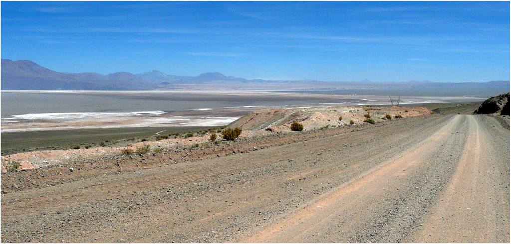 El paisaje interesante lo tenemos a nuestra izquierda ya que la ruta corre bastante más alto que la superficie del Salar del Rincón.