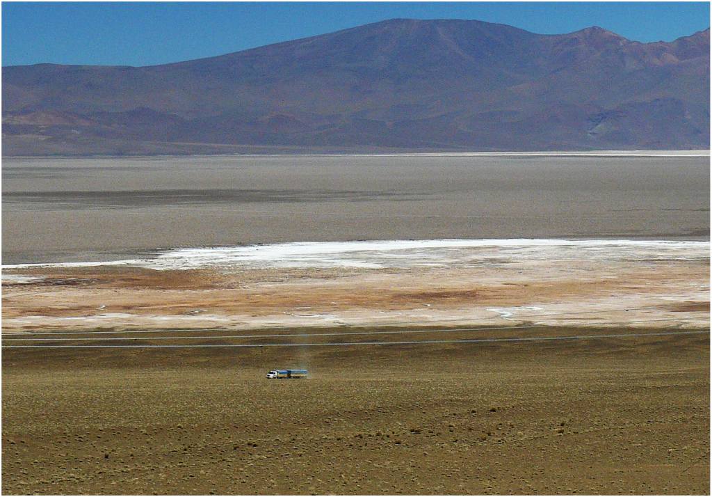 Vemos un camión con acoplado que circula por algún camino de los que cruza la superficie salina ...