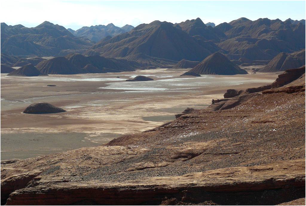 Hacia la izquierda está el Salar de Atacama y a la derecha vemos una sucesión de cerros y volcanes, todos superiores a los 5000 msnm. Entre ellos: Volcanes Lejía, Chilques y Cenizas.