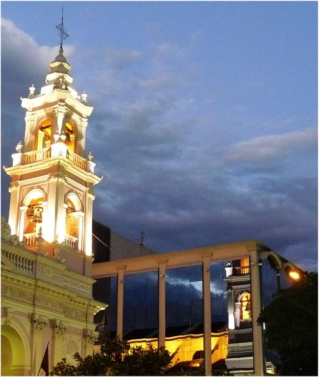 Esa noche la Catedral presentaba iluminada una de sus torres, parte de la cual se reflejaba sobre las paredes de vidrio de un edificio contiguo (a la derecha de la fotografía).