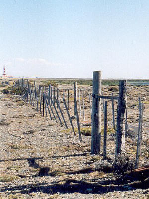 Alambrado doble que demarca el límite. Al fondo el Faro de Punta Dungeness (CHI) |