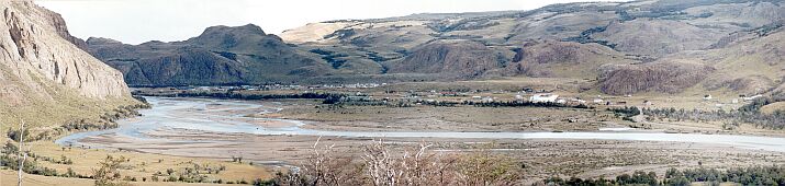 VISTA DE EL CHALTEN DESDE LA CASA DE MADSEN. Se observa sin detalle porque la panorámica se armó a partir de 3 fotos y se disminuyó la resolución por razones de tamaño de archivos |