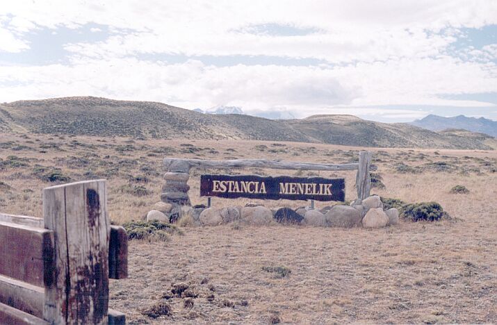 A las 17 hs llegamos a la estancia “Menelik”, que se encuentra fuera de los límites del Parque Nacional. En muchas fotografías había visto su clásico cartel tallado en madera con el monte San Lorenzo como telón de fondo, que en esta oportunidad se encontraba tapado por las nubes.