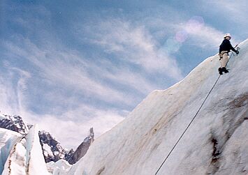 Caminamos un rato por el glaciar hasta encontrar una pared de hielo de unos 8 a 10 mts de altura donde practicaríamos ascenso con las piquetas.