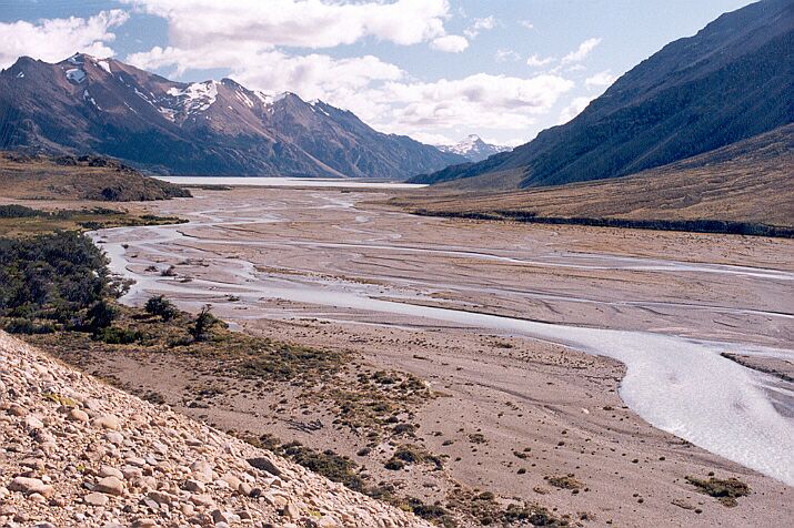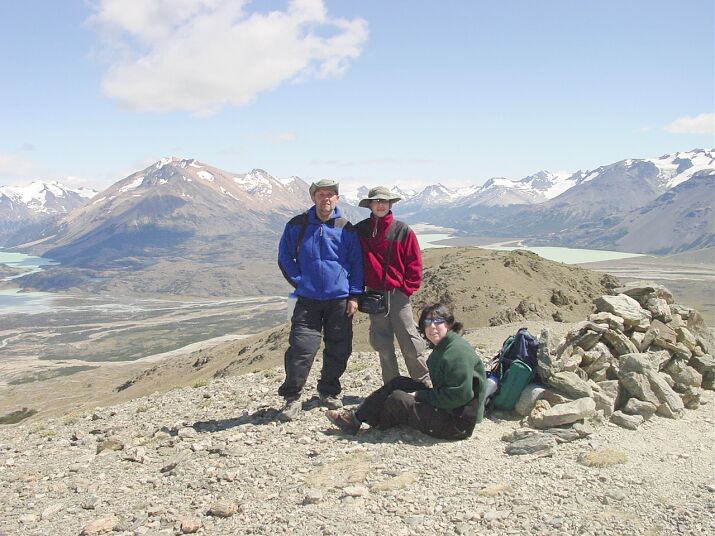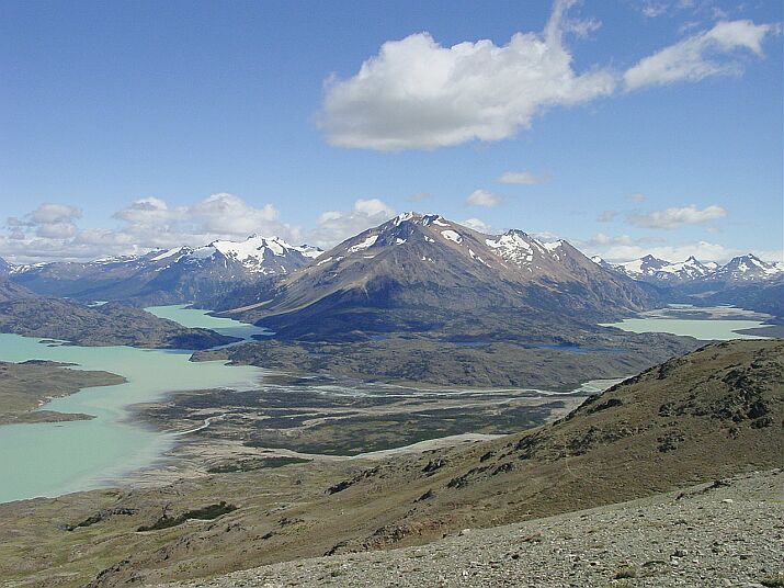 En eso estábamos cuando recordamos las palabras de la Guardaparques respecto a la sorpresa: con ese afán de ver que hay un poco más alla, seguidos caminando directamente al oeste por el filo y de golpe nos quedamos mudos: ahora se veía otro brazo más del Belgrano, el lago y río Volcán, lejos una parte del lago Península y el río Lácteo.