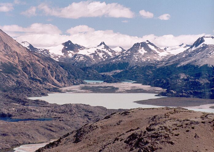 Vista desde la cima del Cerro León: Península Belgrano, Lagos Belgrano y Volcán (click para agrandar) |