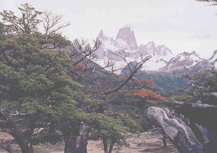 Fitz Roy y agujas vecinas (Poincenot, Mermoz y Guillaumet) desde el mirador |