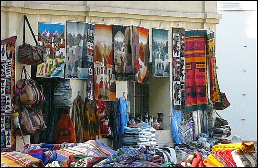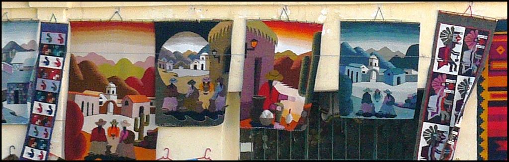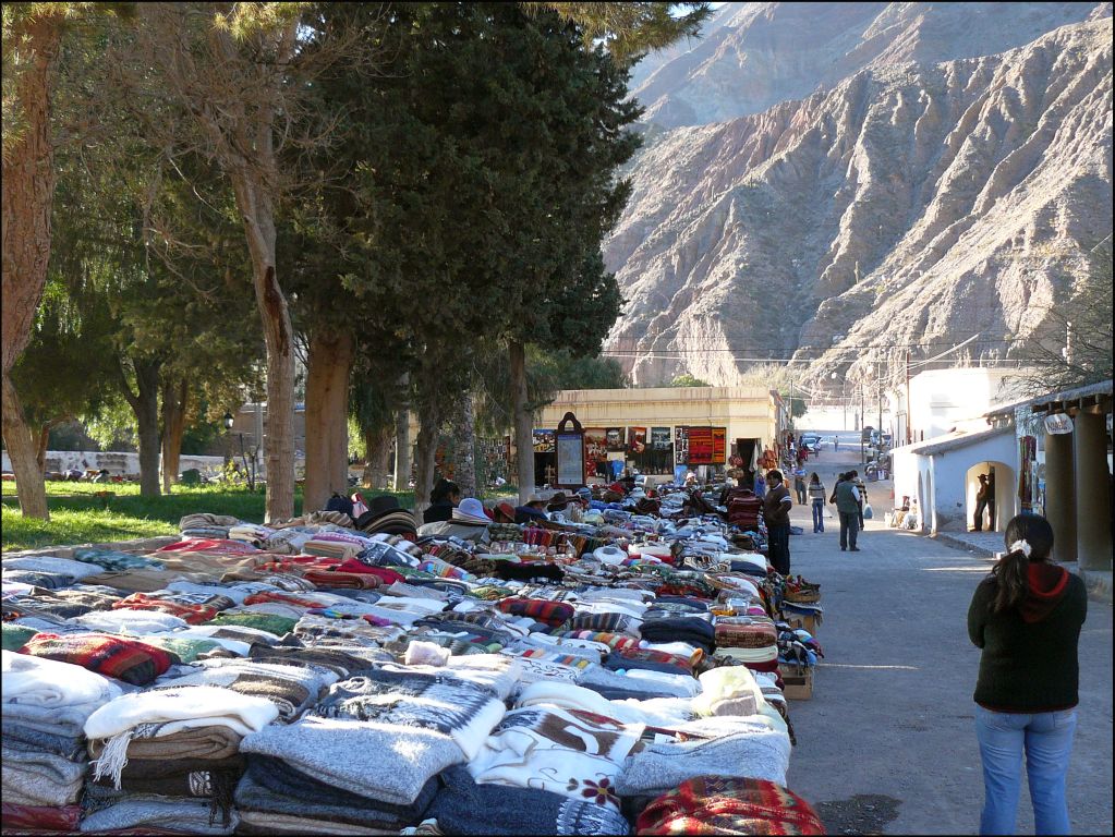 NOTA: me llamó la atención ver una mañana temprano, cuando la mayor parte del pueblo todavía estaba en sus casas y recién estaban empezando a armar los puestos de venta que un señor con un auto muy moderno bajaba muchos ponchos, pulóveres y demás tejidos que repartía a gente local que los distribuía en distintos puestos, dándome una idea, tal vez equivocada, que no se trataba de trabajo de tejido artesanal hecho por la gente que los vendía sino que era confección "industrializada".