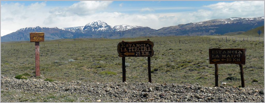 Los carteles indican las distancias a algunas estancias, a saber : La Tercera (25 km), La Maippú (33 km) y El Cóndor (45 km).