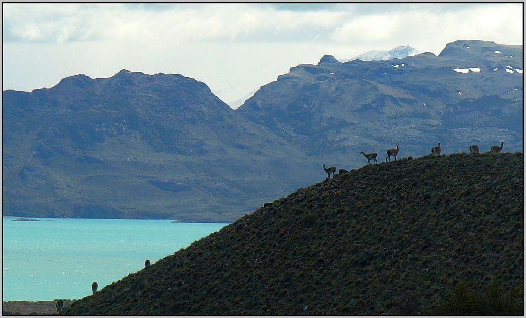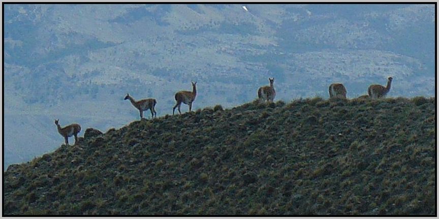 Sobre una lomada se distingue la silueta de una manada de guanacos moviéndose en libertad ...