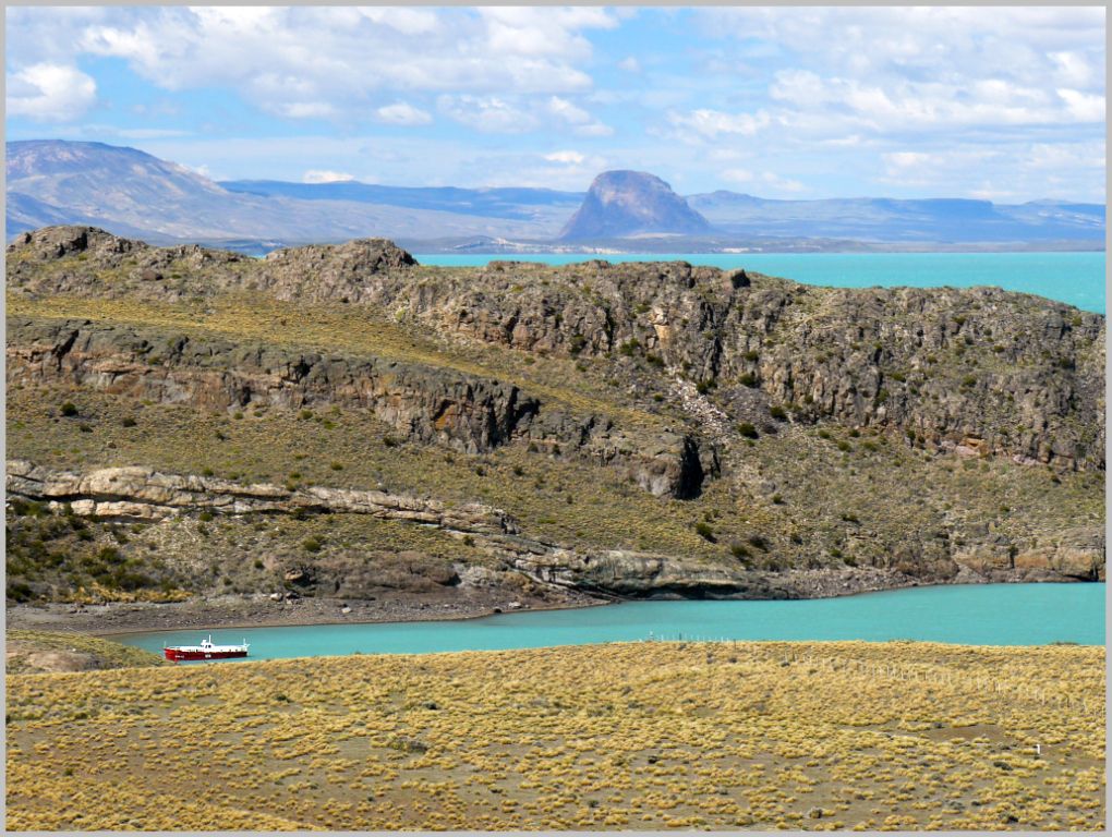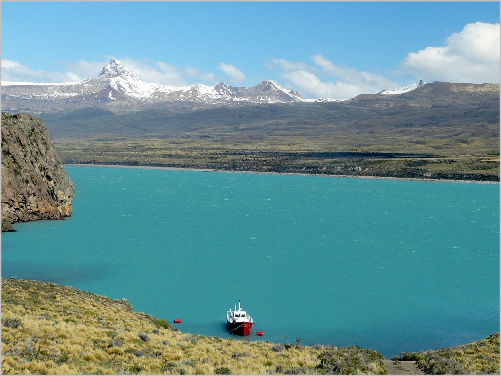 Sobre el Brazo Chacabuco se encuentra anclada la lancha de GNA "GN 45", que desde hace muchos años desafía las aguas embravecidas del Lago cuando hace el relevo del personal y materiales del Grupo "Cocoví".