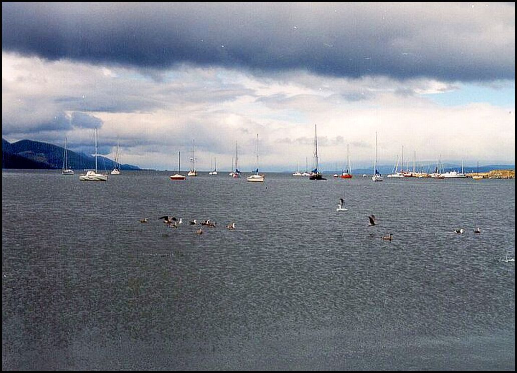 Veleros amarrados frente a la ciudad de Ushuaia y vista del Canal de Beagle.
